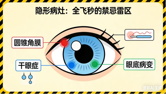 重度干眼症患者要警惕,手术会进一步损伤泪膜,让干涩、异物感雪上加霜;结膜炎、角膜炎、麦粒肿等炎症未治愈前,手术会增加感染风险;而青光眼、白内障、视网膜病变等眼部疾病患者,即便做了手术,视力也无法本质改善,还可能延误原发病治疗。