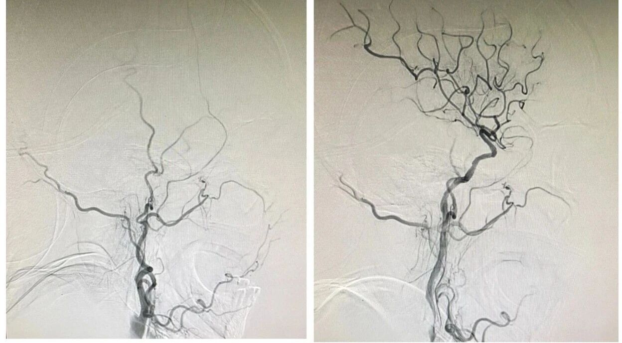 一位突发左侧肢体无力、言语不清的老年高龄患者被紧急送至医院,头颅CT检查提示急性缺血性脑卒中,脑血管造影显示右侧大脑中动脉主干完全闭塞,情况危急。