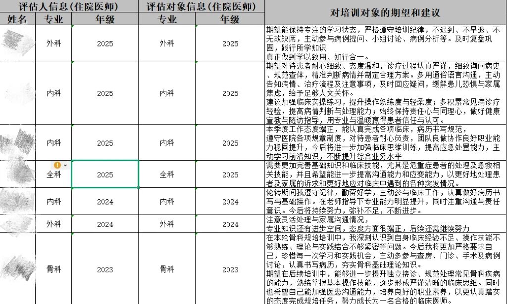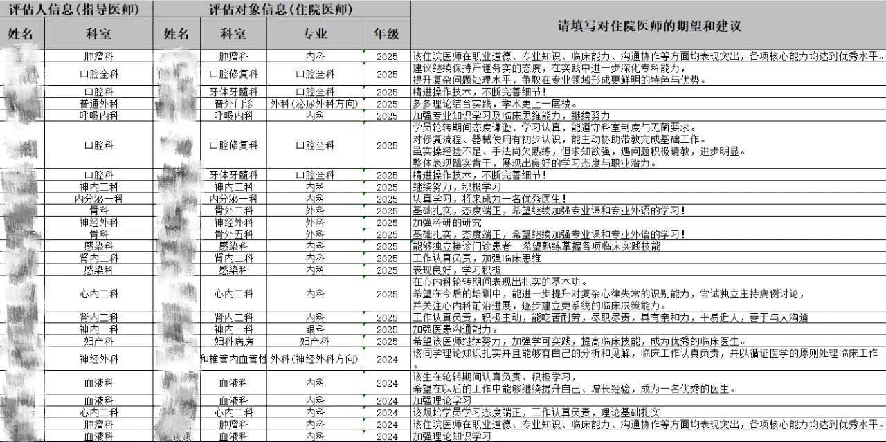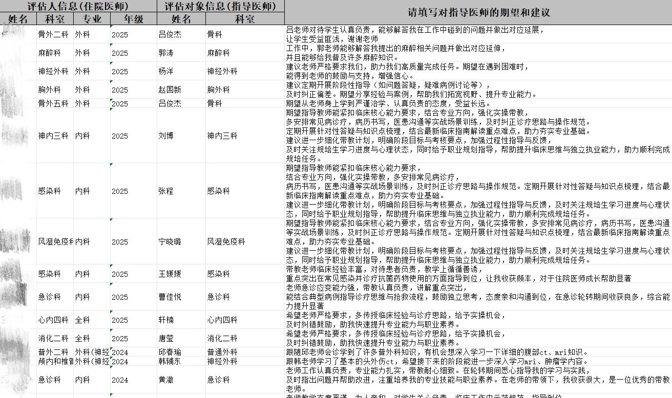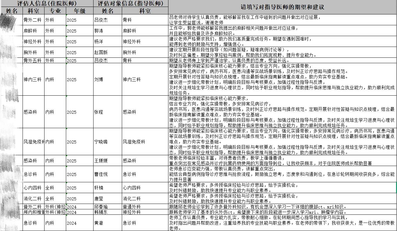 在学员对指导教师评价过程中,学员聚焦指导教师的教学态度、教学能力、临床带教水平、职业素养引领、沟通反馈效率等内容,进行评价。学员们纷纷表示,各位指导教师教学严谨、耐心负责,在临床实操、病历书写、病情研判等方面给予细致指导,以身作则传递医者担当与医德风范,充分发挥了传帮带作用;也针对个性化带教、疑难病例深度讲解等方面,提出了更具针对性的改进建议,推动师生教学相长。指导教师本着客观、负责、精准的原则,对住培学员进行全面评价。教师们充分肯定了学员们本季度在工作态度、临床技能、学习积极性上的进步,认可学员遵守科室规章制度、积极参与诊疗工作、主动钻研专业知识的良好表现;同时,结合学员日常临床工作表现,精准指出学员在临床思维培养、应急处置、复杂操作熟练度等方面存在的不足,并给出具体可行的改进意见,助力学员补齐短板、稳步成长。
